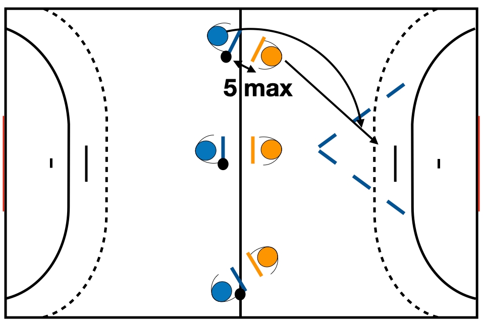 Le but du jeu est de marquer plus de points que son adversaire en 3 minutes. Les deux joueurs échangent le ballon sur place. L’attaquant attaque quand il veut au bout de 5 passes maximum pour aller tirer fort et à rebond dans le but après être entré dans la zone des marques. (1 point).