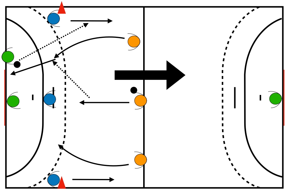 2 plots sur les lignes de touches. 3 équipes de 3 joueurs : 1 en attaque sur la ligne médiane avec 1 ballon. 1 avec 1 défenseur à 6 mètres et 2 joueurs avec la main sur les plots.