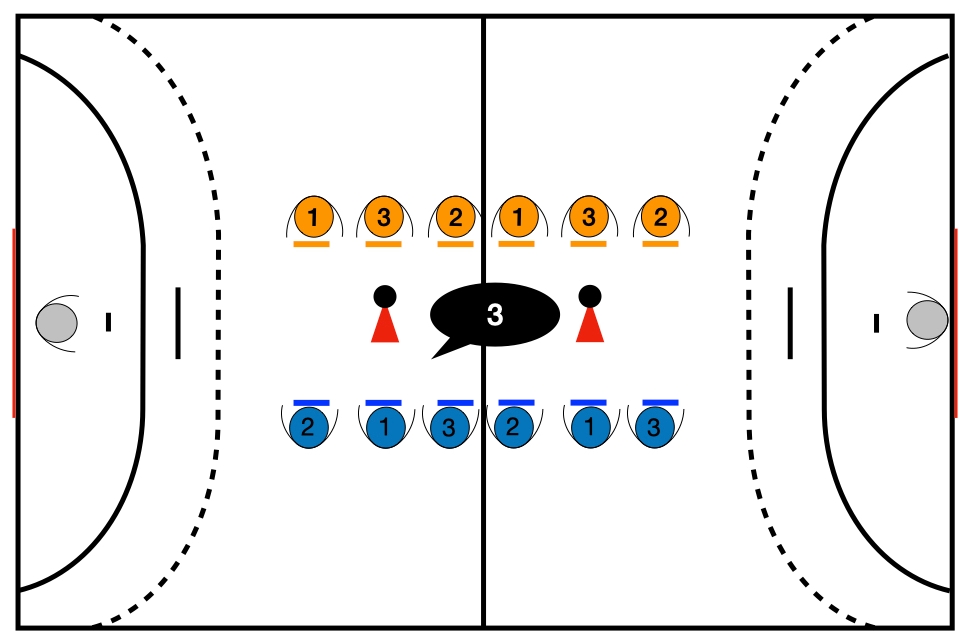 La première équipe a 10 buts gagne la manche. Les scores sont ajoutés entre les 2 groupes de chaque côté. Les joueurs sont numérotés de 1 à 3. L’entraîneur appelle un numéro. Les joueurs ayant ce numéro vont chercher le ballon sur le plot qui est dans leur moitié du terrain. Règles du hand. Les gardiens sont échangés à la fin de chaque manche ou au temps si c’est trop long.