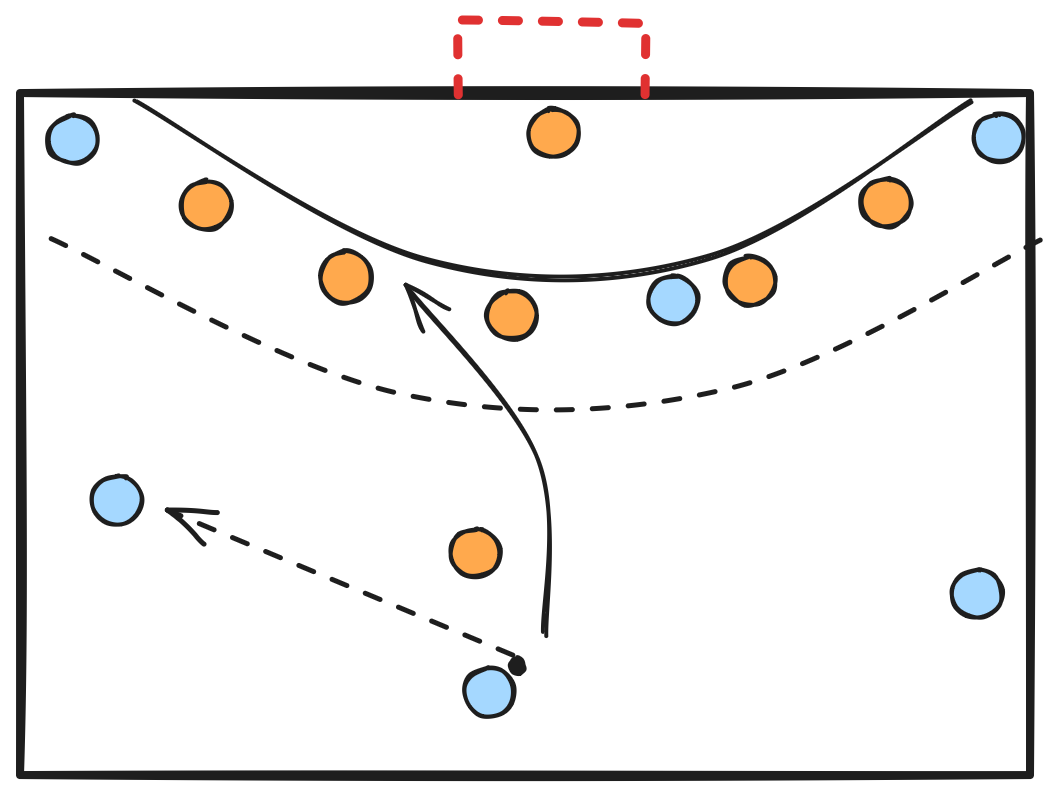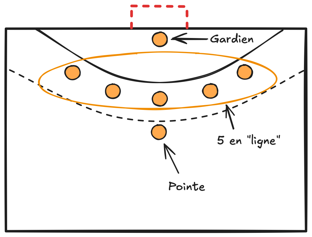 - Un joueur avancé (que nous appellerons la pointe dans le reste du guide) se place à 9-12 m du but, pour gêner la circulation de balle. Ce rôle peut être occupé par différents joueurs selon les intentions défensives de l'équipe.
