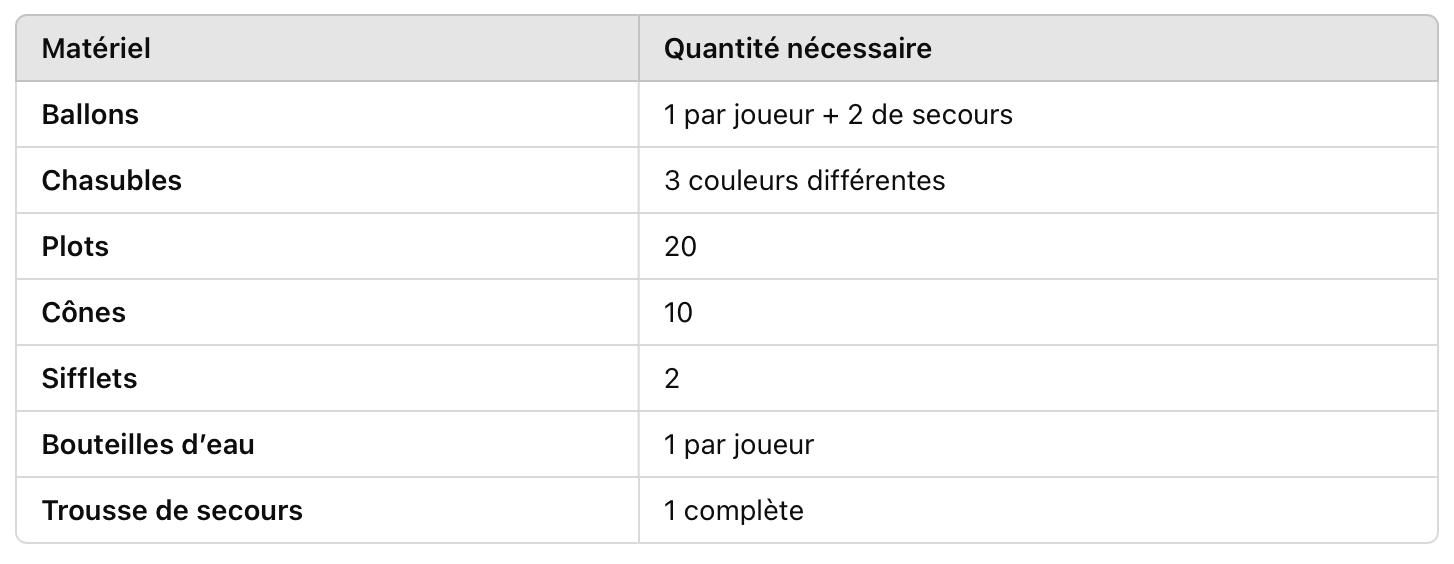 Une bonne préparation matérielle est la clé pour éviter les interruptions. Ballons, chasubles, plots, sifflets... tout doit être prêt à l'avance. N’oublie pas de prévoir des équipements de rechange !
