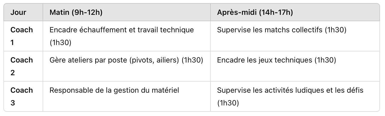 ➡️ Mon conseil pratique : Organise une répartition claire des tâches entre les coachs pour que tout le monde sache ce qu'il doit faire.