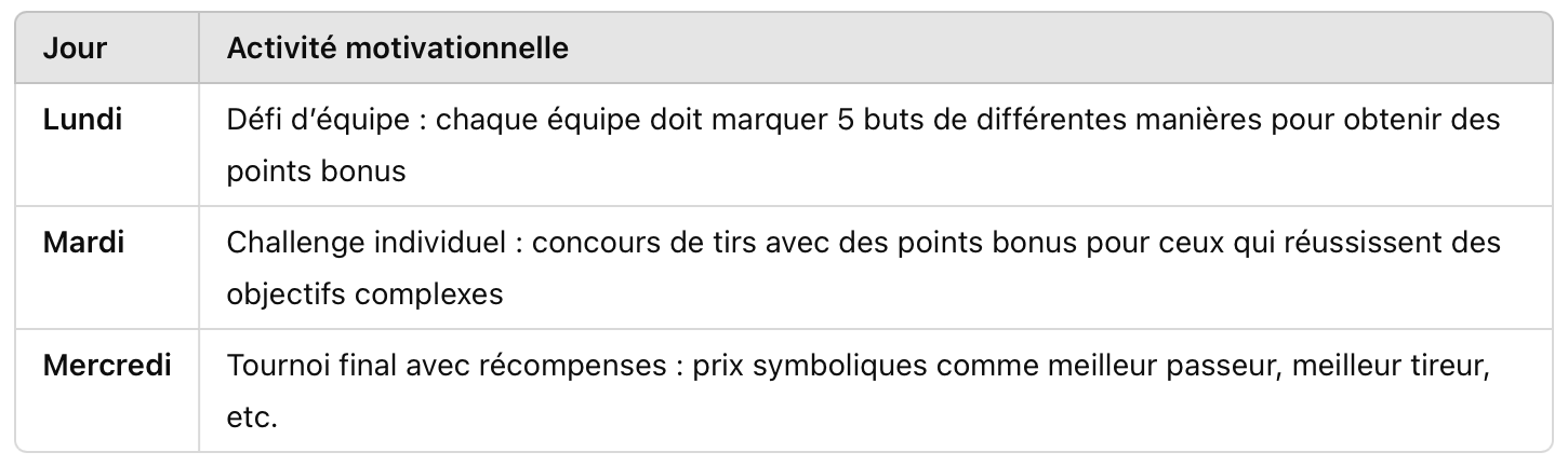 ➡️ Mon conseil pratique : Utilise un outil de suivi de la motivation pour identifier les moments où tes joueurs décrochent et ajuster les séances en conséquence. Télécharge-le à la fin de l’article.