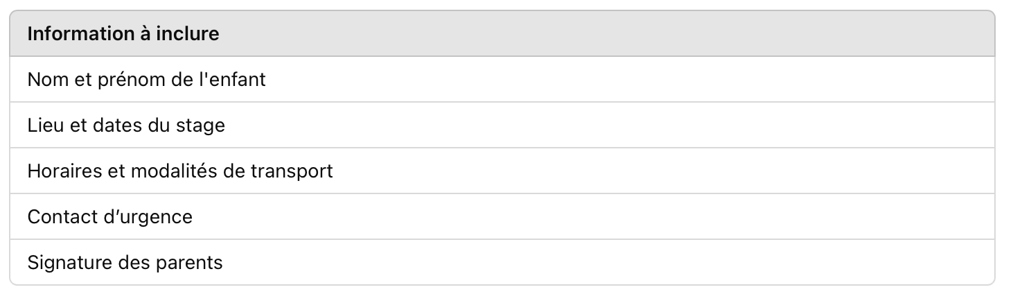 Envoie-leur un planning précis avec les horaires, lieux, et informations sur les déplacements, et assure-toi d’obtenir les autorisations nécessaires.